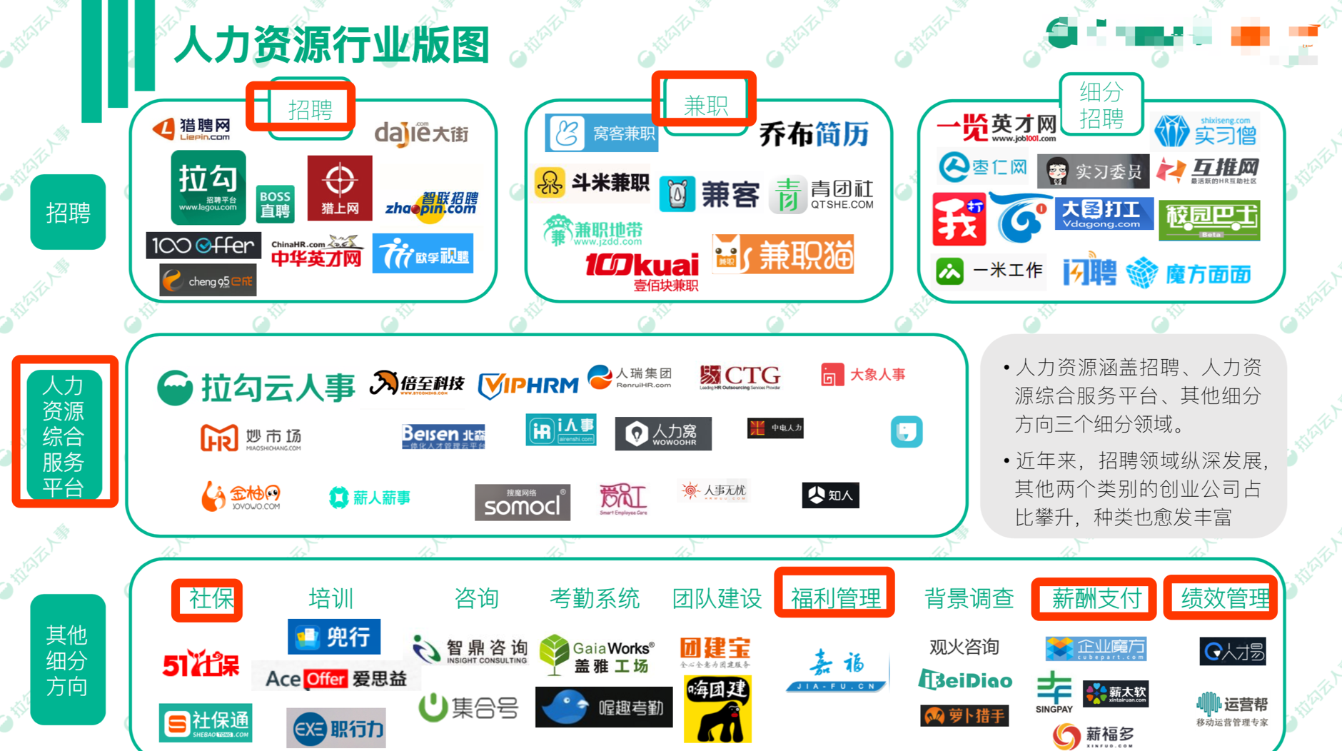 來(lái)看整個(gè)人力資源版圖,目前已知的人力資源領(lǐng)域玩家細分分類(lèi)分別為招聘服務(wù)提供企業(yè)、兼職類(lèi)服務(wù)提供企業(yè)、人力資源綜合服務(wù)平臺類(lèi)企業(yè)、社保類(lèi)服務(wù)企業(yè)、福利管理類(lèi)、薪酬支付類(lèi)及績(jì)效管理類(lèi)企業(yè)。