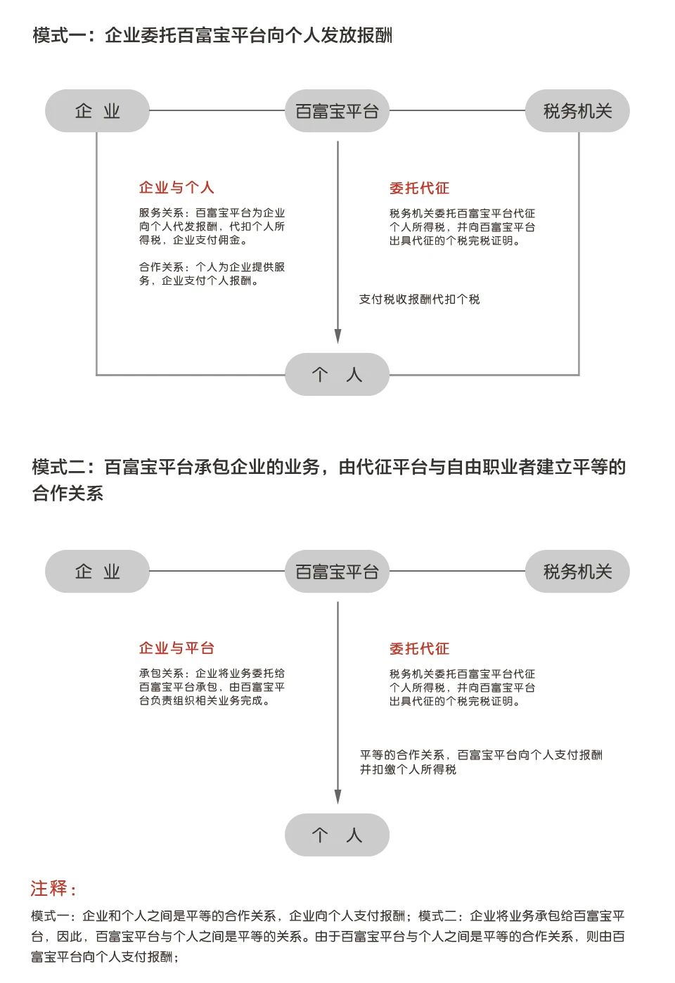 模式說(shuō)明:這類(lèi)企業(yè)在滿(mǎn)足基礎的發(fā)薪完稅的需求之上,提供了產(chǎn)業(yè)鏈的增值服務(wù)。